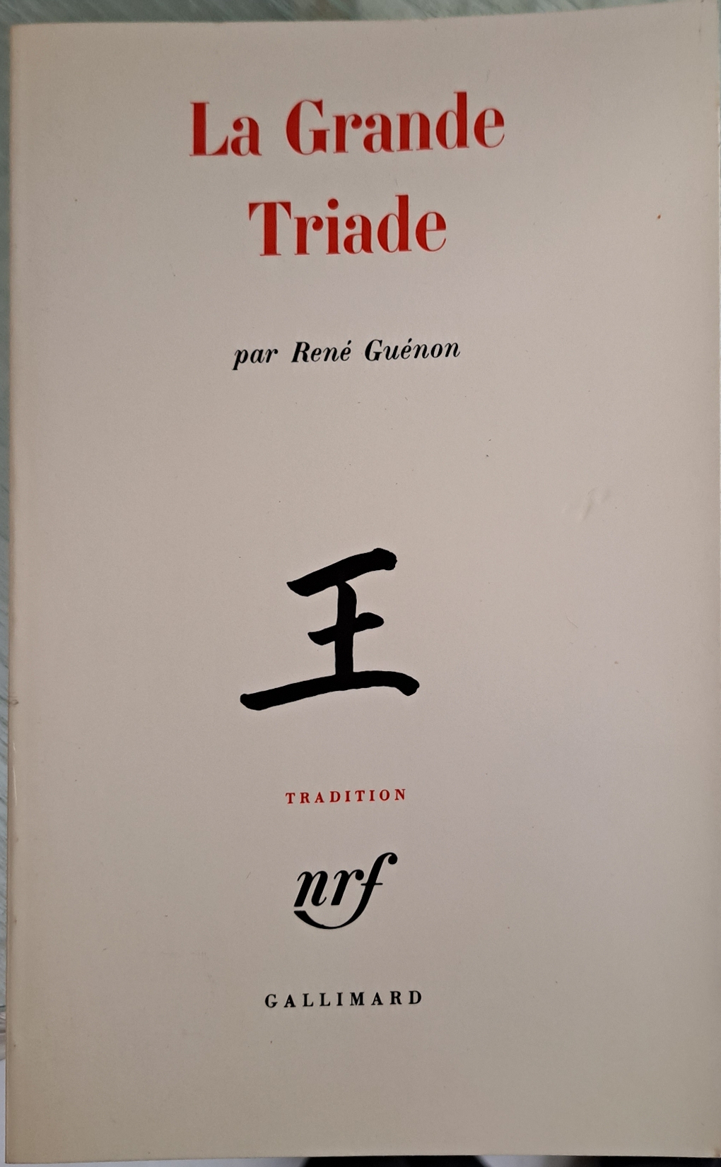 a Grande Triade est un livre de René Guénon paru en 1946. ___L'auteur se fonde sur le ternaire « Ciel, Terre, Homme » du taoïsme, qu'il compare avec d'autres ternaires provenant de différentes traditions spirituelles, pour lui donner un sens universel et pour expliquer que, d'après lui, la « mission » de l'homme sur terre est d'équilibrer les deux principes métaphysiques symbolisés par la Terre et le Ciel et d'en être le « médiateur ».