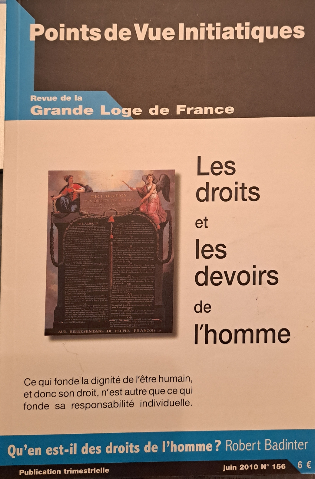 Sommaire : En ce début du XXIe siècle, qu'en est-il des droits de l'homme ?/Déclaration des droits de l'homme et du citoyen de 1789/La déclaration universelle des droits de l'homme de 1948/La commission des droits de l'homme et du citoyen/Droits de l'homme au XXIe siècle, droits et devoirs du fm, éthique et spiritualité/Les anciens devoirs de la loge écossaise d'Atcheson's Haven/La déclaration des devoirs de l'homme et du citoyen de Boissy d'Anglas/.L'opinion de l'abbé Grégoire sur les devoirs de l'homme/Mon droit/Existe-t-il des droits sans devoirs ?/Le fm, homme de devoir/Droit et devoir de l'initié/Le droit et le devoir de vivre, le droit et le devoir de mourir/La leçon de Simone Weil/La déclaration des droits de l'enfant de 1959/DEvoirs et leçon/Le code noir/De l'abbé Grégoire à Victor Schoelcher/Un régime d'exception fondé sur la négation des droits de l'homme; L'Etat français (19409 à 1944) et ses précurseurs/Fondements initiatiques des droits de l'homme : L'exemple de Léopold Sedar Senghor.